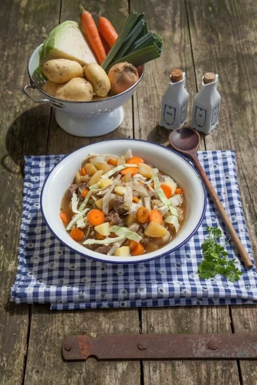 Kartoffeln, Möhren, Sellerie und Zwiebeln schälen und würfeln. Lauch, Weißkraut oder Wirsing putzen, waschen und in Streifen schneiden. Fleisch grob würfeln.