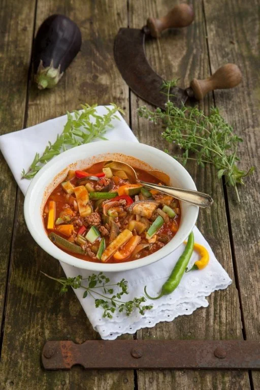 300 g Auberginen, 300 g Zucchini, 100 g Staudensellerie, 100 g Salatgurke, je 1 kleine gelbe, grüne und rote Paprika, 5 Schalotten, ¼ l Rinderbrühe, 2 Knoblauchzehen, 3 EL Öl, 750 g Hackfleisch, 500 g geschälte Tomaten, Salz, Cayennepfeffer, frischer Thymian und Oregano