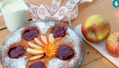 Äpfel schälen und das Kernhaus ausstechen. Butter, Zucker, Vanillezucker und Zitronenschale gut schaumig rühren. Eier und Milch nach und nach dazugeben. Mehl, Mandeln und Backpulver sieben und unterheben. In eine gefettete Form füllen und die Äpfel hineinsetzen. Mit Marmelade füllen. Bei 200° C (Ober-/Unterhitze) ca. 40 Minuten backen. Etwa nach der Hälfte der Zeit mit Alufolie abdecken, damit die Äpfel nicht zu braun werden. Aus dem Ofen nehmen, mit Butter bepinseln und mit Zucker bestreuen. Dazu Vanillesauce, Sahne oder Eis servieren.