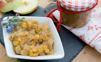 Die Äpfel schälen, entkernen und klein würfeln. Die Zwiebeln schälen und hacken. Zusammen mit den Maiskörnern, dem Zucker sowie dem Essig in einem Topf mischen. Zum Kochen aufstellen und nach dem ersten Aufkochen die Hitze zurückdrehen. In etwa ½ Stunde zu einem dicklichen Brei köcheln. Salzen und pfeffern. Entweder heiß oder kalt genießen. Das Relish passt zu Kurzgebratenem und Gegrilltem.
