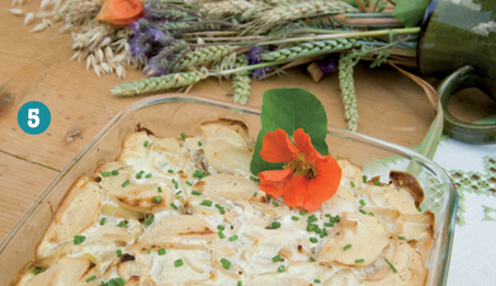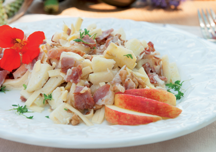 Butter zerlassen, Zwiebelringe hinzufügen, mit Salz bestreuen und glasig dünsten. Apfelscheiben auf die Zwiebeln legen und alles zugedeckt dünsten, bis die Äpfel fast gar sind. In einem zweiten Topf Butter zerlassen, Schinkenwürfel darin ausbraten. Eine Auflaufform fetten, nacheinander Kartoffeln, Schinkenwürfel und Zwiebel-Apfelmasse einschichten Creme fraîche und Ei verquirlen, mit Pfeffer, Salz und Kräutern abschmecken und über den Auflauf verteilen. Im vorgeheizten Backofen bei 225° C 20-30 (Ober-/Unterhitze) Minuten backen. Dazu schmeckt grüner Salat.