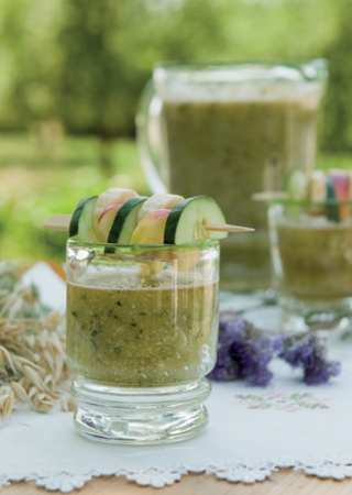 Die Äpfel schälen, entkernen und klein würfeln. Ebenso die Salatgurke und die Bananen in kleine Stücke schneiden. In den Mixer geben. Nach Bedarf mit Apfelsaft aufgießen.