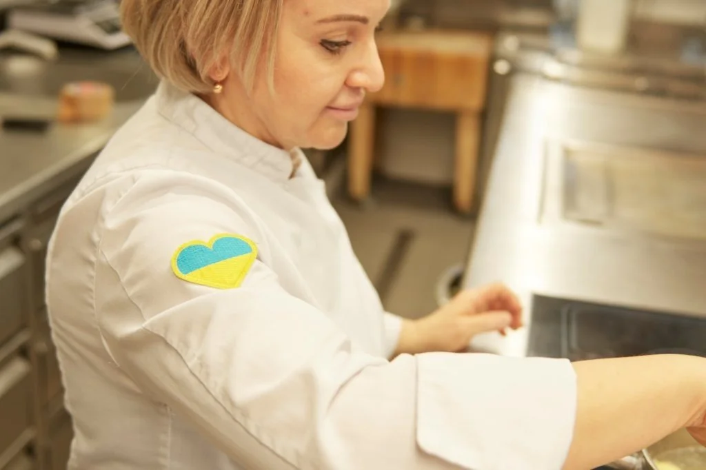 Luda hat sich für den Termin sehr hübsch gemacht: Ihre blonden Haare sind perfekt gestylt, das schöne Gesicht ist adrett geschminkt. Blütenweiß ist die Kochweste – am rechten Ärmel ist ein blau-gelbes Herz in den ukrainischen Landesfarben aufgenäht: „Das habe ich von meiner Tochter bekommen“, sagt sie so stolz wie glücklich und bietet ein Tellerchen mit ukrainischer Schokolade an. Sehr köstlich! Ein wenig nervös ordnet sie die vier dicht per Hand geschriebenen Blätter. Auf das Interview hat sie sich vorbereitet, auch mit Hilfe ihrer Deutschlehrerin. Integration ist ihr wichtig und dazu gehört auch die Sprache zu lernen und so fehlerfrei wie möglich aus ihrem Leben zu erzählen – tief durchatmen. Dann mal los: